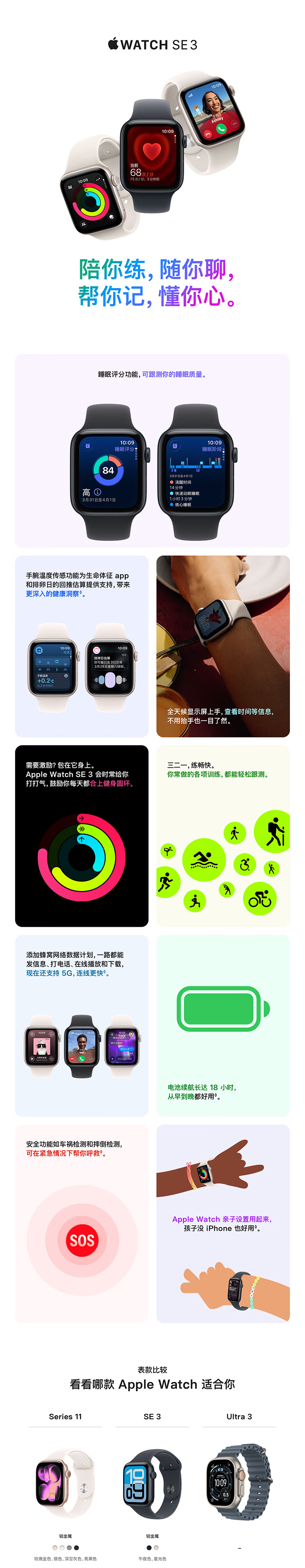 Apple/苹果 Watch SE 3 智能手表GPS+蜂窝款44毫米午夜色铝金属表壳